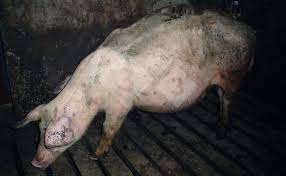 In most cases pigs will be found dead. It can occur at any age, although most commonly in the grower stage between 25 and 100kg. The typical case will have a grossly swollen abdomen often with the rectum protruding and will rapidly discolour and decompose. The whole carcass will be pale. Post mortem examination is essential
